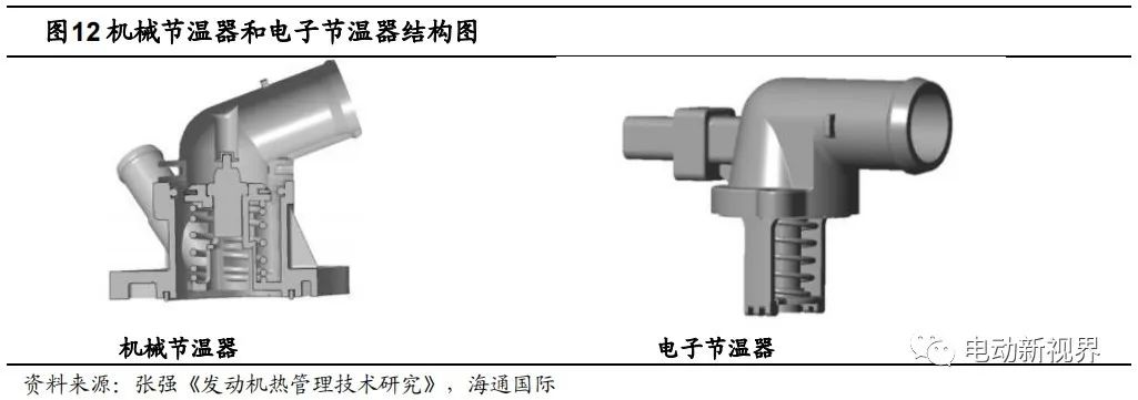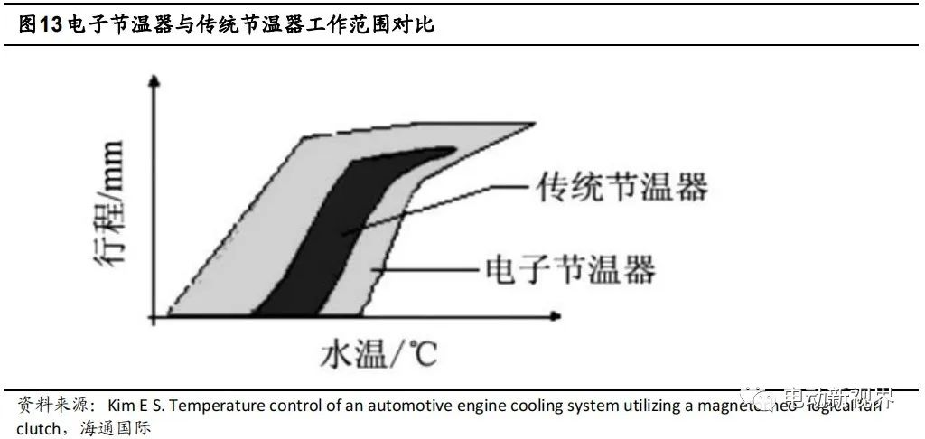 電子節溫器技術與傳統熱管理方案相似,其主要差異在于將傳統的機械式節溫器更換成電子節溫器。傳統節溫器是將感應溫度的石蠟結構浸泡在發動機冷卻液中,當冷卻液溫度升高后,石蠟受熱膨脹后將節溫器閥門頂開,從而開啟冷卻系統大循環。電子節溫器是通過 ECU 發送信號加熱電阻來實現石蠟加熱膨脹,從而開啟冷卻大循環。與傳動的節溫器相比,電子節溫器的響應更快、溫度調節范圍更寬。