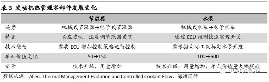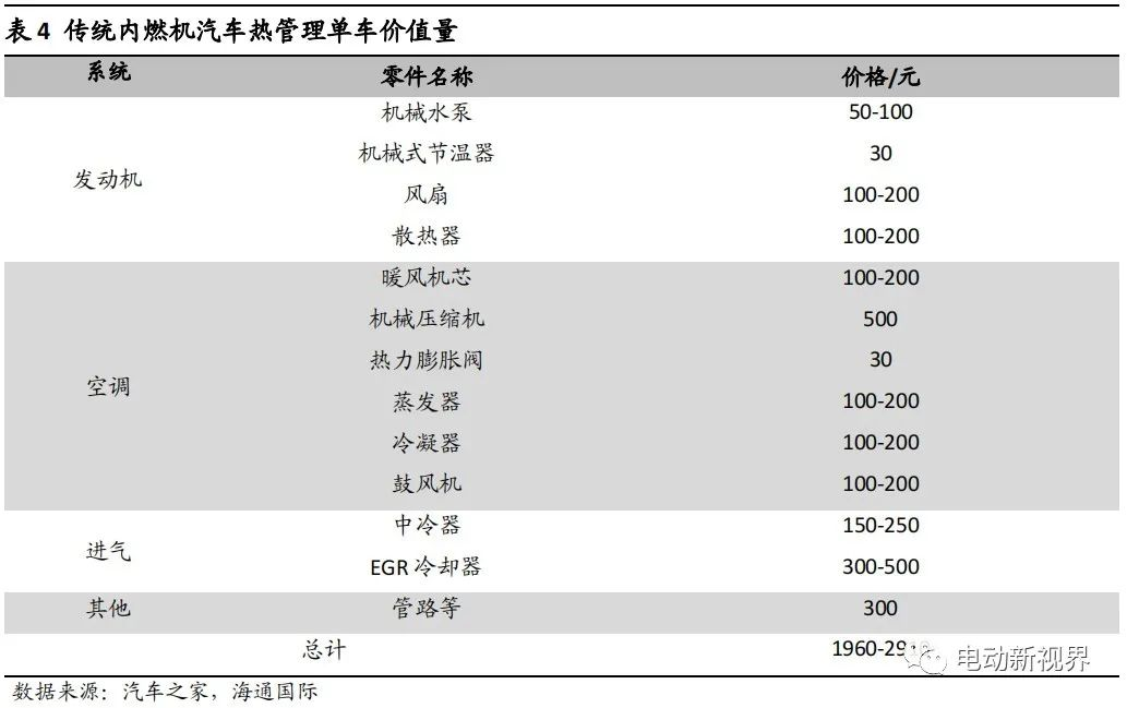 傳統內燃機汽車熱管理模塊拆分成發動機、空調、進氣三個子版塊,總計整個熱管理系統的單車價值量在 1960-2910 元之間。而隨著電子水泵、電子節溫器等零部件的滲透,單車價值量會繼續提升。