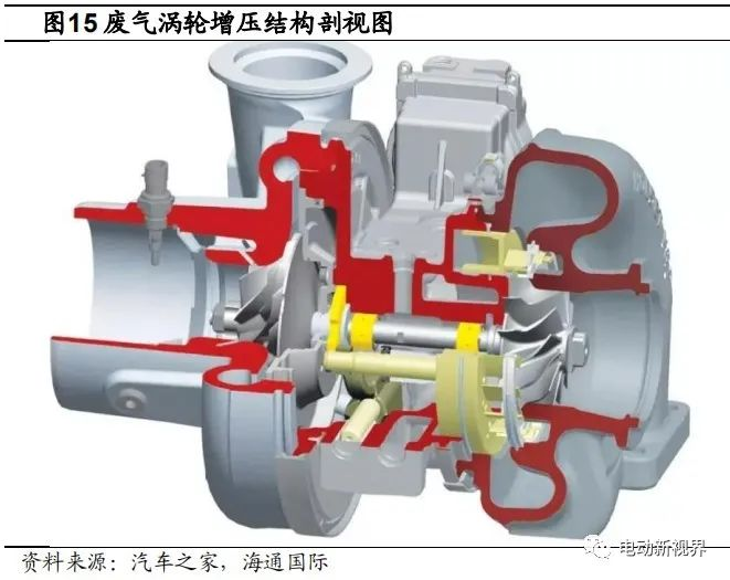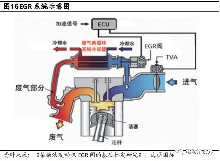 傳統內燃機還有兩項專有的重要技術,增壓、EGR(廢氣再循環)。渦輪增壓系統利用發動機排氣動能壓縮進氣,提高充氣效率,有益于混合氣的形成以及缸內燃燒;而廢氣再循環系統通過將部分廢氣返回到發動機氣缸再次燃燒,主要是為了減少尾氣中氮氧化物含量。但這兩項技術分別需要對于熱管理的需求都很高,所以傳統內燃機架構中必不可少的就是中冷器和 EGR 冷卻器。