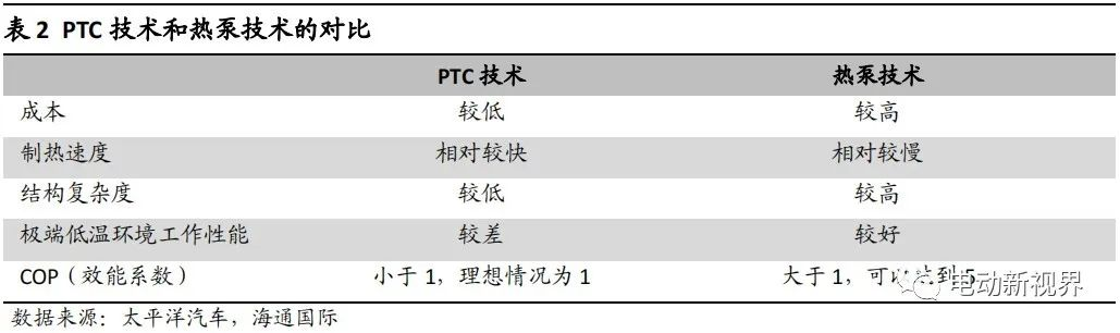 艙內供熱、為三電系統提供合適工作溫度傳統內燃機熱效率可以達到 40\%左右,通過有效的熱管理系統可以回收發動機產生的余熱,提供給駕駛艙進行供暖。但是,新能源汽車沒法利用燃燒產生的熱量,主流制熱方案有空氣(風暖)PTC、水暖 PTC 和熱泵空調等。