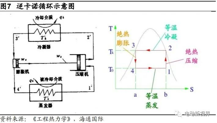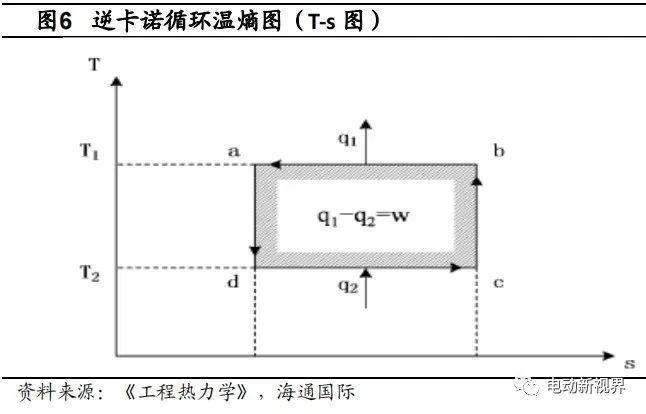 PTC 技術具有成本低、制造工藝簡單、加熱迅速等優點,但是采用 PTC 對電動車供暖會嚴重削減汽車的續航里程,并且 PTC 技術的 COP 小于 1,效率較低。在此背景下,熱泵技術更為所關注。從原理角度上講,熱泵核心原理就是逆卡諾循環,熱泵消耗的功可以使環境中的熱量遷移到高溫熱源上,其效能系數大于一并不違反熱力學第一定律,即能量守恒定律,因為高溫熱源所吸收的熱量不僅僅來自熱泵所消耗的功,也來自低溫熱源(即大氣環境)中的熱量。而 PTC 技術從能量轉化的角度僅僅是電能轉變成熱能,所以 COP 值在理想情況下最高也只能達到 1。