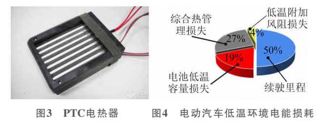 電動(dòng)汽車熱空調(diào)采用PTC電加熱器(圖3),其特點(diǎn)是功率大、制熱速度快,主流的暖風(fēng)空調(diào)功率在3~6kW,暖風(fēng)1h需耗費(fèi)3~6度電。以特斯拉Mod-elY為例,其百公里耗電大概13度電(kWh)左右,加熱系統(tǒng)的額外耗電及其綜合熱管理?yè)p失,使汽車?yán)m(xù)航能力下降幅度可達(dá)27\%左右,再加上低溫衰減的影響,實(shí)際的續(xù)航里程衰減可能要達(dá)到40\%~50\%(圖4)。