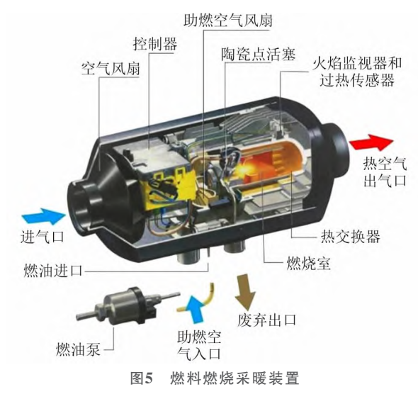 為滿足冬季取暖與動(dòng)力電池的預(yù)熱需求,目前采用的加熱裝置,一種是燃料燃燒采暖裝置(圖5),制熱效率高、耗電低,但與電動(dòng)汽車的零排放相違背,另一種就是采用電加熱裝置。