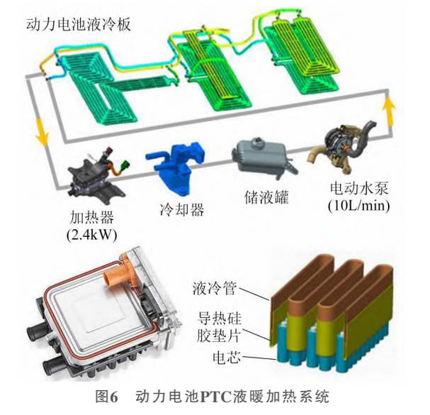 以空氣為介質(zhì)的風(fēng)暖因?qū)﹄姵亟M加熱不均勻而逐漸被淘汰,以液體為介質(zhì)的加熱均勻度較好,且可以利用電機(jī)、電機(jī)控制器、DC/DC產(chǎn)生的余熱幫助電池達(dá)到工作溫度,所以PTC液熱系統(tǒng)逐漸成為當(dāng)前空調(diào)及動(dòng)力電池加熱(圖6)的主流技術(shù),但此種方式耗電量大也是新能源汽車的一個(gè)痛點(diǎn)。目前在電池本身耐低溫性能沒(méi)有突破的情況下,采取的措施是提高電能的制熱效率。