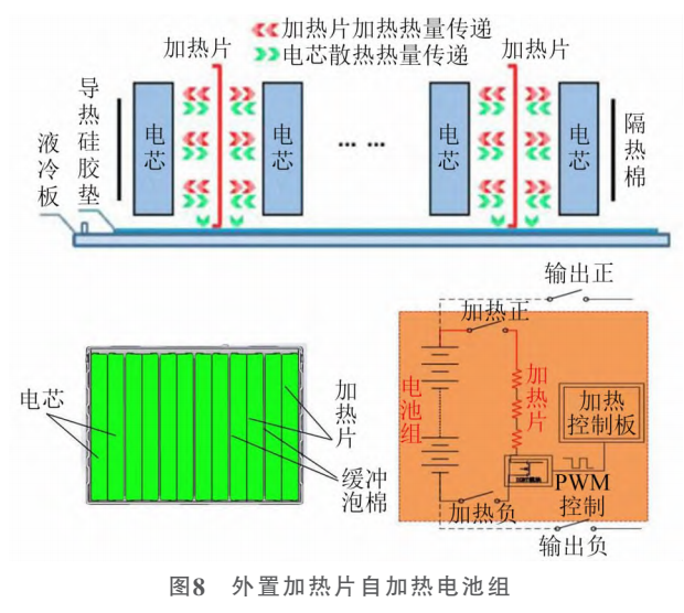 3.在電芯之間放置加熱片(高功率金屬箔鎳)通電生熱,快速使電芯升溫,即全氣候電池(圖8)