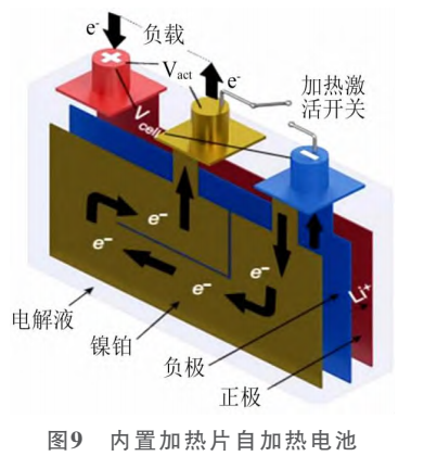 美國(guó)賓西法尼亞州立大學(xué)王朝陽(yáng)教授團(tuán)隊(duì)采用將加熱片置于電池芯內(nèi)的技術(shù),即全氣候自加熱型鋰電池(簡(jiǎn)稱ACB),加熱片(鎳鉑片:厚度50μm在25℃時(shí)電阻為56mΩ)與電池正負(fù)極連接,利用電池自身的能量使其快速升溫,溫度升高后即可在低溫環(huán)境下進(jìn)行充電或行車,可徹底解決電池低溫瓶頸問(wèn)題(圖9)。因該方案采用物理加熱方法,對(duì)電池壽命影響小,且加熱過(guò)程不依賴外部設(shè)備。