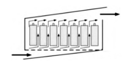 這一冷卻技術選擇空氣作為冷卻介質,借助對流熱交換原理來達到電池組降溫的目的。空氣冷卻電池技術本身具備維護成本低、制造成本低廉的應用特點,因此可以被廣泛應用于動力電池的保護裝置。同時空氣冷卻電池技術在應用過程中也存在受到空氣比熱容以及導熱系數性質的制約,為此空氣冷卻電池技術的電池組冷卻效率并不高。現階段主要應用冷卻空氣流動路徑為從底部流入、從頂部流出(如圖1所示),這一流動路徑選擇是側方流入另一方流出冷卻效率的 2 倍。