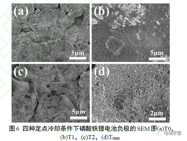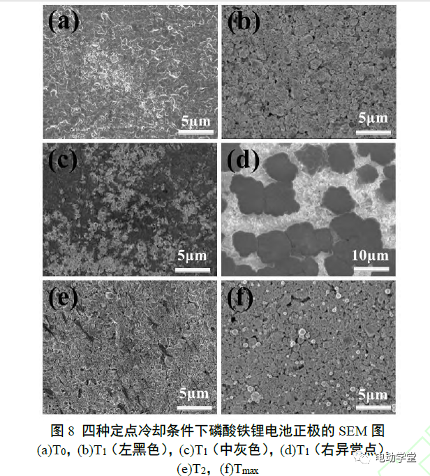 8顯示了四種定點冷卻條件下磷酸鐵鋰電池正極的SEM圖。電池開始自發(fā)熱時,電池正極表面可觀察到活性材料顆粒,且表面覆蓋沉積物,推測來自于電解液分解產(chǎn)物。