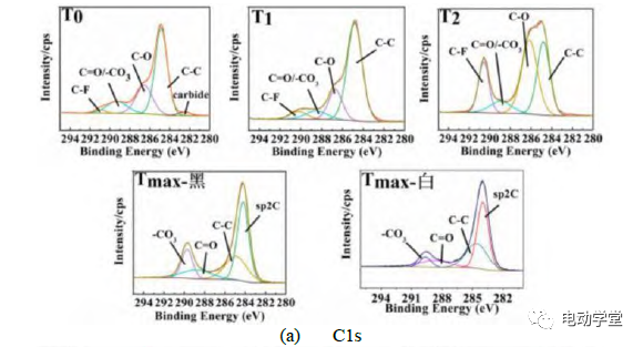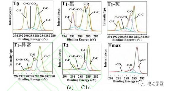 至完全熱失控時,含C物質(zhì)情況發(fā)生較大變化。從溫度達到Tmax的電池來看,正極表面無法檢測到C-F,C-O、-CO3還有少量存在,新出現(xiàn)sp2C,且sp2C所占含量最多。