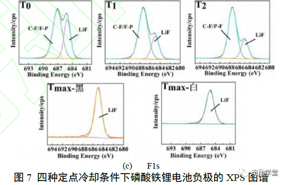 7(c)為四種定點冷卻條件下磷酸鐵鋰電池負極的F1sXPS圖譜。在溫度達到T0時,負極表面的F存在C-F、F-P、LiF三種形式,其中,C-F代表著含氟有機物的生成;F-P代表殘留電解質(zhì)鹽LiPF6的存在以及相應(yīng)分解產(chǎn)物PFx的存在。