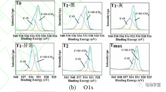 7(b)為四種定點冷卻條件下磷酸鐵鋰電池負極的O1sXPS圖譜。在溫度達到T0時,負極表面的O存在C=O、-CO3、C-O三種形式,其中,C-O代表著PEO低聚物的生成;C=O代表ROCO2Li、Li2CO3等烷基鋰碳酸鹽的存在。