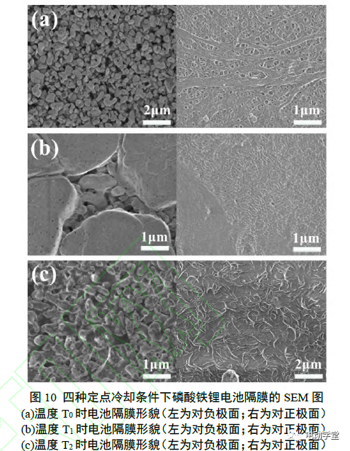 5)對于磷酸鐵鋰電池而言,當溫度處于T0點時,正負極均已開始發(fā)生副反應(yīng);當溫度達到T1點時,負極SEI膜破壞發(fā)生明顯副反應(yīng),正極界面膜增厚,隔膜閉孔且有明顯異物;當溫度達到T2點時,負極開始內(nèi)短路,正極界面膜增厚且表面發(fā)生碳化,安全閥開啟,電解液和氣體噴出,隔膜熔斷;當溫度達到Tmax時,隔膜已完全破壞,正、負極粉末大面積脫落。