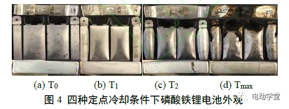 4顯示了四種定點冷卻條件下磷酸鐵鋰電池的外觀。可以發(fā)現(xiàn),隨著熱失控過程的進行,磷酸鐵鋰電池鼓脹程度逐漸加劇,電池熱失控結(jié)束后盡管外包裝仍然存在,但有明顯燒蝕現(xiàn)象。電池泄壓閥打開后,大量電池燃燒產(chǎn)物附著在殼體外部。