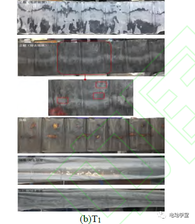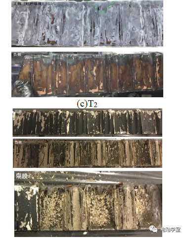金色區(qū)域代表負極為嵌鋰態(tài),黑色區(qū)域的出現(xiàn)表明在T1狀態(tài)下電池發(fā)生內(nèi)短路,導(dǎo)致負極局部發(fā)生快速脫鋰。而分離出的隔膜雖然仍基本完整,但已存在一定程度的拉伸變形。表明在T1溫度下,隔膜發(fā)生一定程度的收縮,導(dǎo)致電池發(fā)生內(nèi)短路。