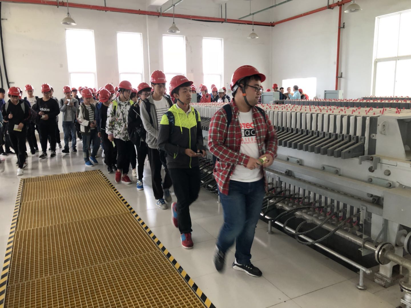 在公司相關部門負責人的陪同下,來訪師生先后參觀了華清基地的自動化電鍍生產線、廢水處理中心、廢水處理監控室、廢水處理池等核心車間,基地的工作人員就基地的廢水處理工藝、流程及設施,向工大師生做出了具體的介紹。工大師生在了解了廢水中心的先進技術和優秀工藝之后,對華清基地的廢水處理工程欽佩不已。