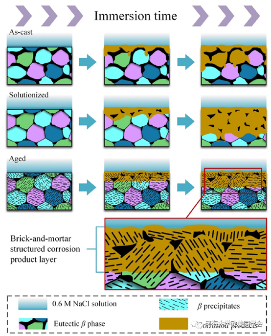 腐蝕測試顯示,時效態鎂合金初期的耐蝕能力由于較強的微電偶腐蝕效應存在而弱于鑄態和固溶態,但隨著腐蝕的進行,β相的屏障效應凸顯,使得耐蝕能力優于其它兩種狀態的合金。通過有限元模擬和微觀形態觀察,推測腐蝕產物膜和分級結構β相構成了類“磚-漿”結構,其“膜-相”協同調控是鎂合金耐蝕性較大幅度改善的主因(圖2)。