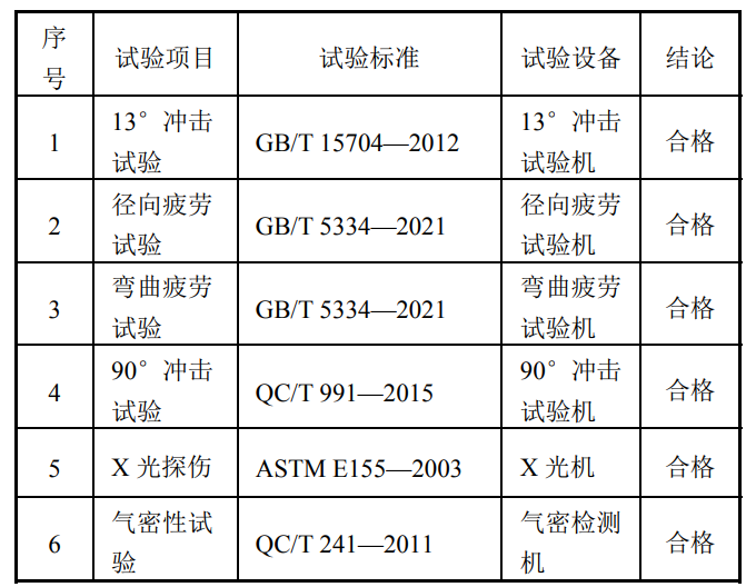 使用已有車型規格的鎂合金車輪進行臺架試驗和整車道路試驗,驗證鎂合金車輪強度是否滿足開發要求,試驗條件嚴苛度不低于量產鋁合金車輪,試驗結束后,鎂合金車輪未出現裂紋、變形等現象則判斷合格。