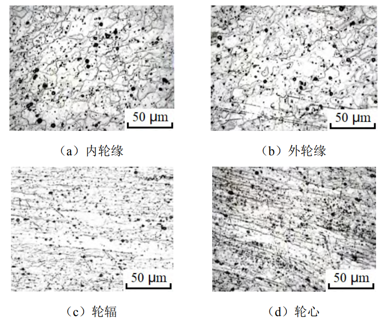 合金車輪不同部位金相組織切片,結果顯示,鎂合金內部析出晶粒細小,且均勻地分布于晶體的晶界處,金相組織沒有出現聚集偏析現象。