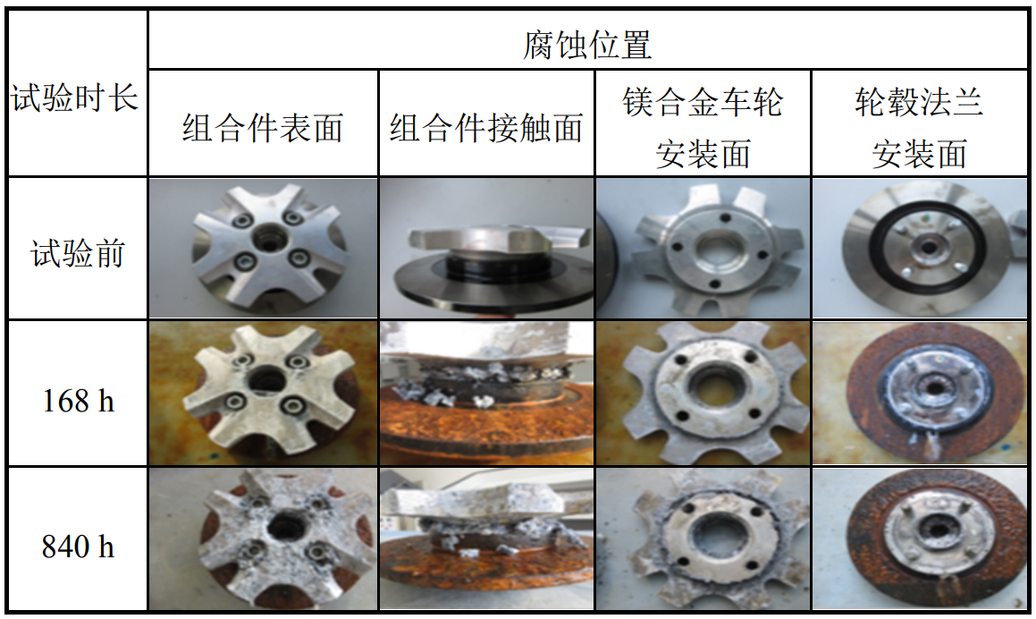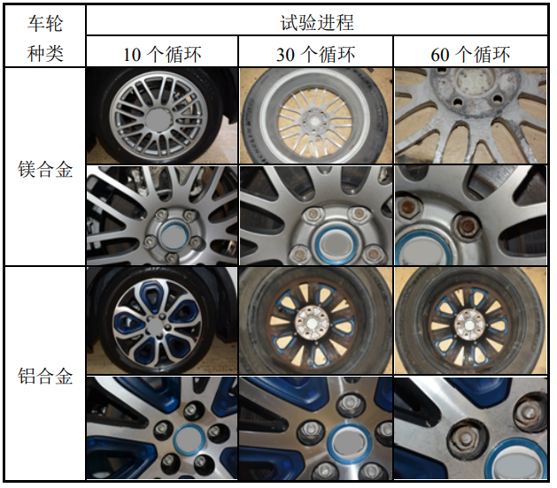 使用已有車型規格鎂合金車輪進行臺架試驗和整車腐蝕試驗,驗證鎂合金車輪防腐能力是否滿足整車開發要求,試驗條件嚴苛度不低于量產鋁合金車輪,試驗結束后鎂合金車輪未出現氣泡、涂層脫落、周邊零部件連接區域及螺母安裝孔區域掉塊或車輪螺母無法拆卸的現象則判斷合格。