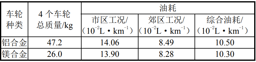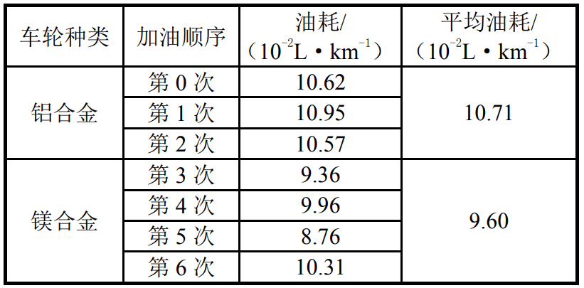 對采用原裝配鋁合金車輪的燃油車和更換為同規格鎂合金車輪的燃油車進行實車路試,在市區測試 6 天累計運行 2800 km,試驗數據見表 5, 后者相比前者百公里油耗降低 10.36%。