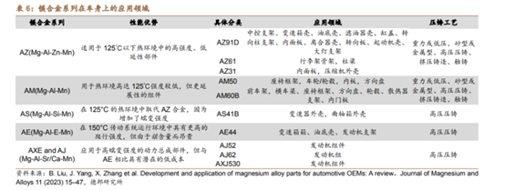 4)動力總成:鎂合金也開始被廣泛應用于發動機和傳動的外殼,以及油底殼等部件。由于鎂合金具有出色的鑄造性能,一些發動機座、缸蓋、齒輪箱和油底殼等零件開始采用鎂合金取代鋁合金。例如,大眾和奧迪都配備了鎂合金發動機和變速箱,其材料的工作溫度低于120攝氏度。鎂合金氣缸蓋能夠實現約33%的重量減輕,并顯著提高發動機的抗噪聲和減震性能。油底殼則采用耐熱鎂合金材料,在與鋁合金相比較時,重量可減輕33%。例如,本田Insight和CA20的鎂合金油底殼都實現了重量的大幅度減輕。綜上所述,鎂合金在動力總成中的發動機和傳動外殼、油底殼等部件中的應用越來越廣泛。鎂合金材料不僅能夠減輕重量,還能改善發動機的性能特點,如抗噪聲和減震能力,為汽車提供更高的性能和效率。