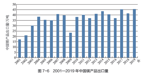 根據中國有色金屬工業協會的統計數據顯示,2019年我國的原鎂產量為96.9萬噸,較去年增長了12.2%。目前,全球約有45%的原鎂用于生產鎂合金,其中70%用于汽車行業,20%用于3C電子產品,而10%則應用于軍工等領域。如圖7-6所示,2019年我國出口的原鎂和鎂制品數量達到了45.16萬噸,占全球總產量的53%。在鎂合金的深加工產品中,壓鑄方式仍然占主導地位,但存在一定的局限性,制約了鎂合金應用的大規模擴展。因此,進一步攻關變形鎂合金產品的加工技術和應用技術顯得尤為重要。