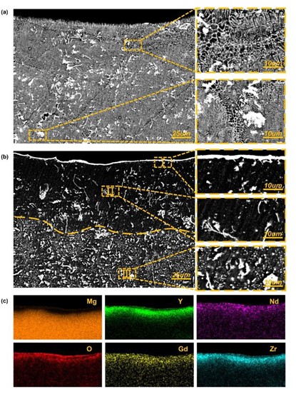 圖2:鎂合金支架高溫氧化處理前后橫截面上的 SEM 形貌(a-b)和 EDS 分析(c)