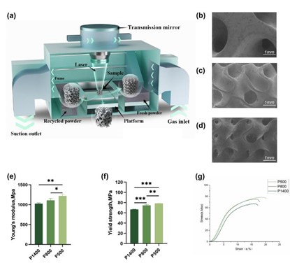 我們的研究團隊制備了三種不同孔徑的鎂合金支架,分別為500微米、800微米和1400微米(P500、P800和P1400)。這些不同孔徑的鎂合金支架表面形貌相似,并且沒有明顯的缺陷(圖3b-d)。然而,它們在體外的力學行為卻存在明顯差異,其中P500表現出良好的結構性能(圖3e-g)。