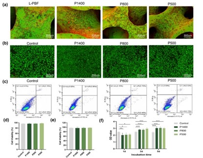 為了評估鎂合金支架的生物相容性,我們將骨髓間充質干細胞直接植入P500、P800和P1400組的鎂合金支架上。結果顯示,骨髓間充質干細胞能夠良好地附著在P500、P800和P1400組的支架表面(圖4a)。研究團隊采用間接接觸法測試了鎂合金支架的體外生物相容性。細胞活力/死亡染色、細胞凋亡測試和CCK-8細胞毒性試驗結果顯示,所有組別的細胞具有良好的相容性,并且各組別之間沒有顯著差異(圖4b-d)。