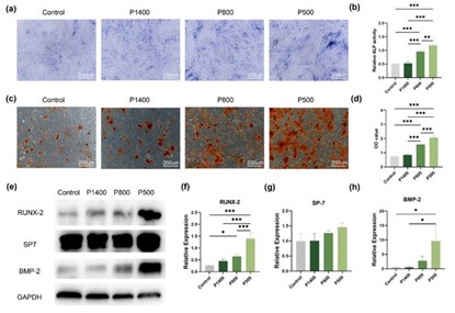 隨后,為了測試鎂合金支架的體外成骨性能,我們在培養基中添加了地塞米松、L-抗壞血酸和β-甘油磷酸鈉進行成骨誘導。如圖5a-d所示,鎂合金支架組的堿性磷酸酶活性和細胞外基質的礦化水平均較對照組高,其中P500組的骨髓間充質干細胞具有最顯著的成骨性能。隨后,通過蛋白質免疫印跡實驗定量分析了成骨相關分子蛋白的表達水平,結果顯示P500組的成骨相關分子蛋白表達水平較其他組更高(圖5e-h)。