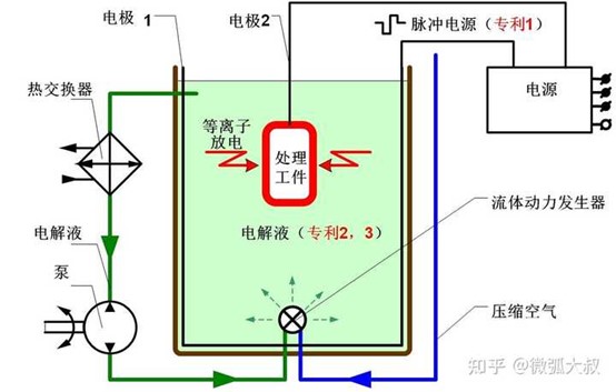 微弧氧化(Micro-arcOxidation,MAO),又稱微等離子體氧化(Micro-plasmaOxidation,MPO)、陽(yáng)極火花沉積(Anode Spark Deposition,ASD)、等離子體增 強(qiáng)電化學(xué)表面陶瓷化(Plasma Enhance Electrochemical Surface Ceramic coating, PECC)等技術(shù),是一種鋁、鎂、鈦及其合金表面在電解液中依賴外加電場(chǎng)使其表 面原位反應(yīng)生成自身金屬氧化物的新技術(shù)。圖 1 是微弧氧化設(shè)備結(jié)構(gòu)示意圖,從 圖中可以看出將鋁、鎂合金制品做陽(yáng)極,不銹鋼做陰極,置于脈沖電場(chǎng)環(huán)境的電 解液中,樣品表面因受端電壓作用而發(fā)生等離子體放電,所產(chǎn)生的高溫高壓條件使微區(qū)的鋁、鎂原子與溶液中的氧結(jié)合生成與基體以冶金方式結(jié)合的氧化鋁或氧化鎂陶瓷層。