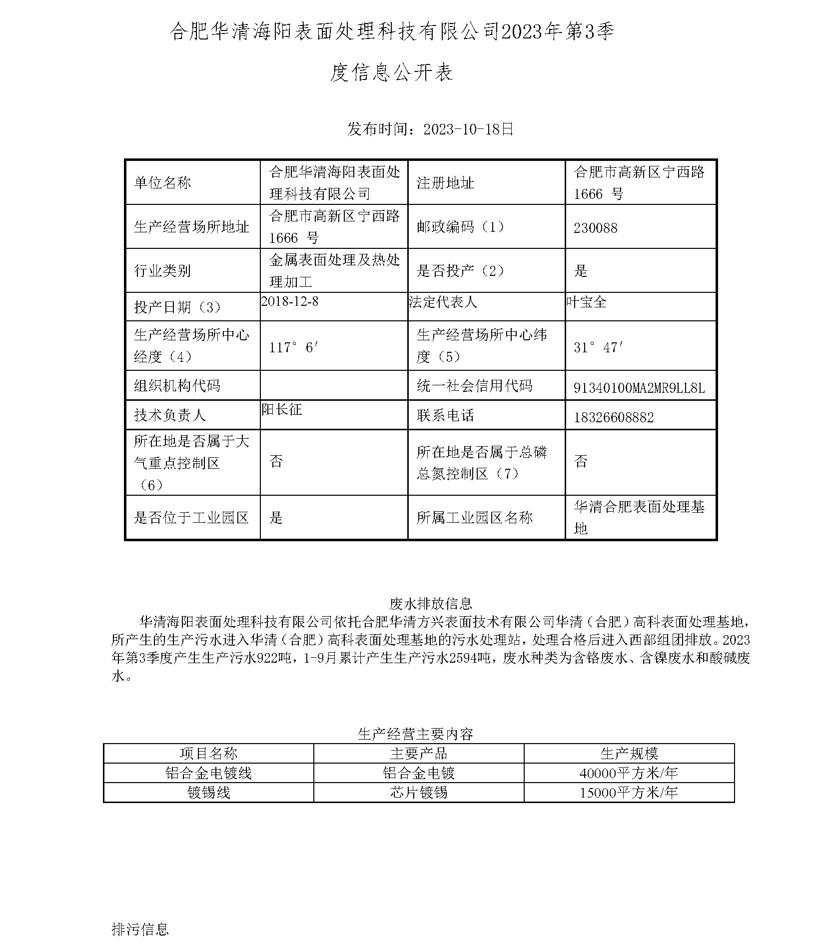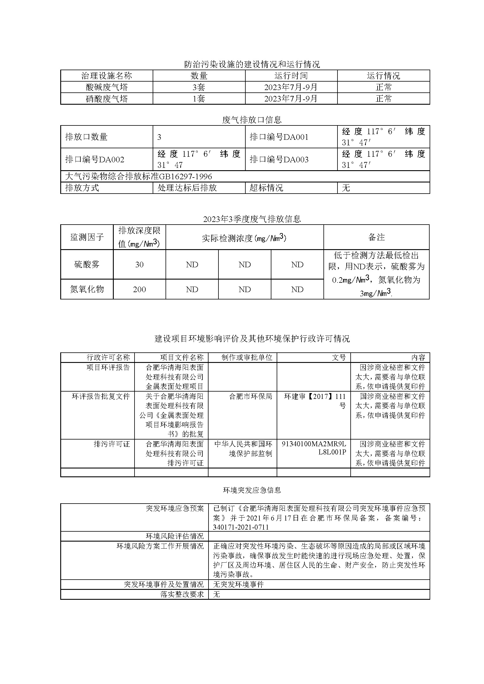 合肥華清海陽表面處理科技有限公司2023年第3季度信息公開表