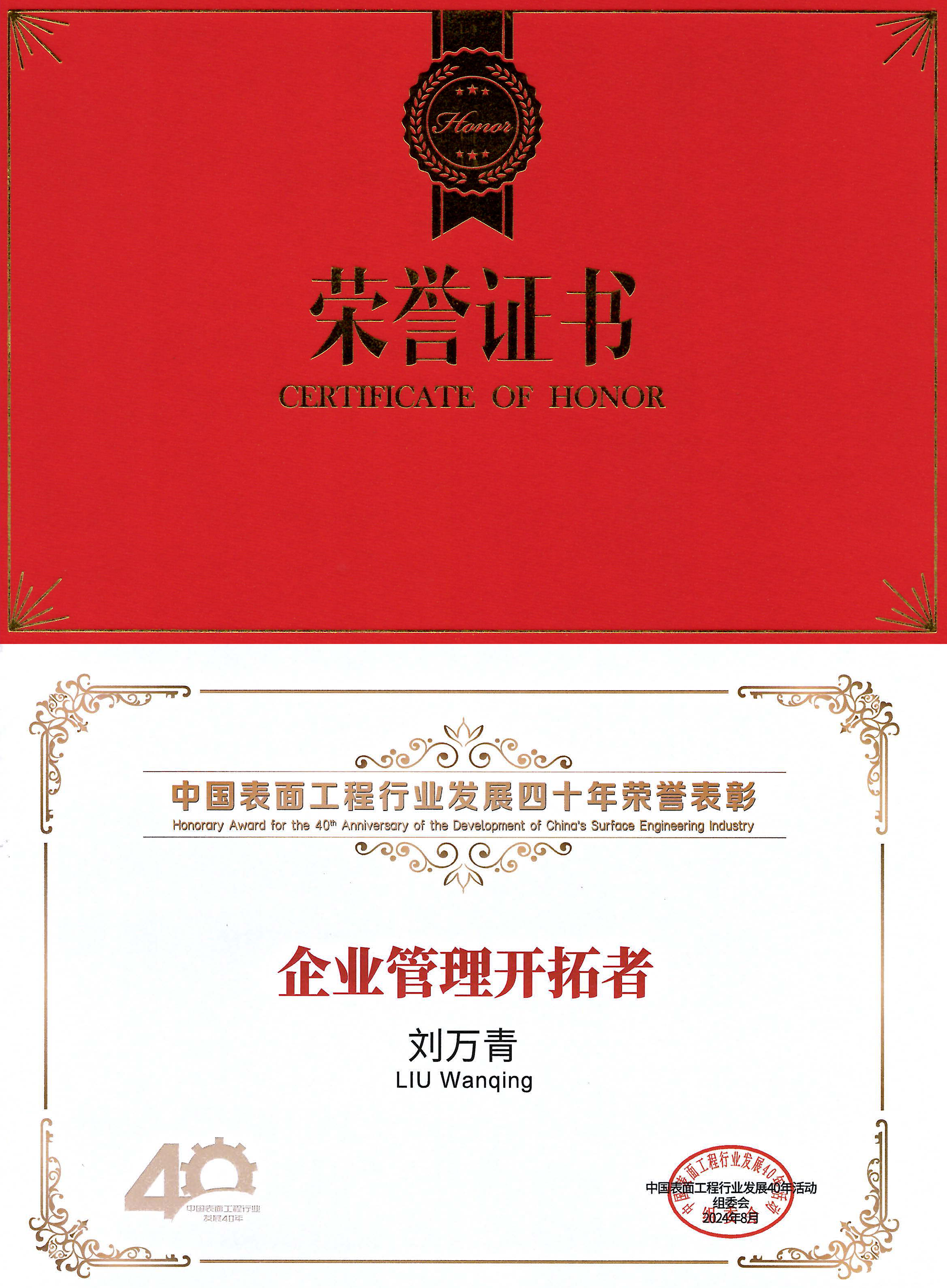 中國(guó)表面工程行業(yè)發(fā)展四十年組委會(huì)對(duì)合肥華清高科表面技術(shù)股份有限公司及公司董事長(zhǎng)劉萬(wàn)青個(gè)人的表彰,充分體現(xiàn)了對(duì)合肥華清高科表面技術(shù)股份有限公司在表面工程領(lǐng)域的肯定,以及對(duì)董事長(zhǎng)劉萬(wàn)青在行業(yè)中鉆研不懈、躬行實(shí)踐的高度認(rèn)可。